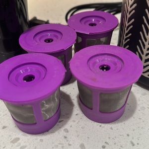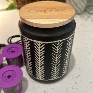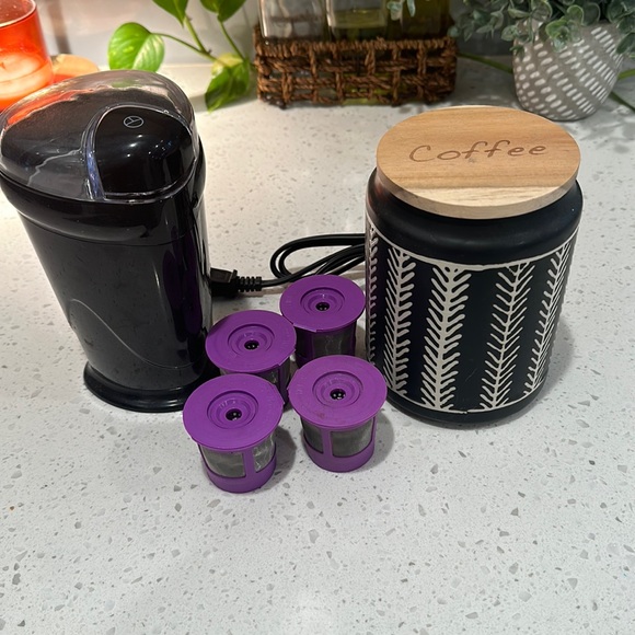 Coffee bundle includes 4 reusable K-Cups, decorative coffee container, and coffee bean grinder. All in good condition. Smoke free home.