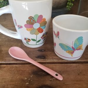 Sweet mom and daughter Coffee Cups. Pretty pastel flowers and butterflies adore around the outsides. Built in spoon and holder. Enjoy a special moment with your daughter using these for a tea party for princesses. Perfect condition with no chips or cracks.