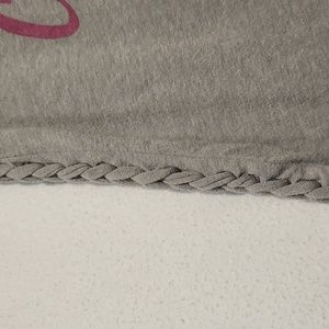 Heather Grey Tee. 50/50 poly/cotton. Scooped neck with pink binding. Braid detail on sides. Comfy shirt. Pit to pit 20", length about 25"