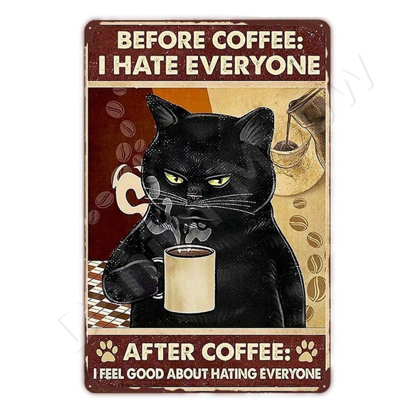 Beautiful black cat tin art sign. Words for cat and coffee lovers. Timeless and gorgeous artwork. Perfect gift for the cat aficionado. Brand New, vintage styed, cat art photo sign. FAST SHIPPING. This wall decor cat sign measure approximately 12 x 8 inch (30 cm x 20 cm). Made of heavy gauge metal. High quality ink baked to signs to promote long life, quality full color litho printed. This durable tin sign is weather resistant, water-proofed and easy to hang, pre-drilled 4 holes in each sign for easy mounting.
