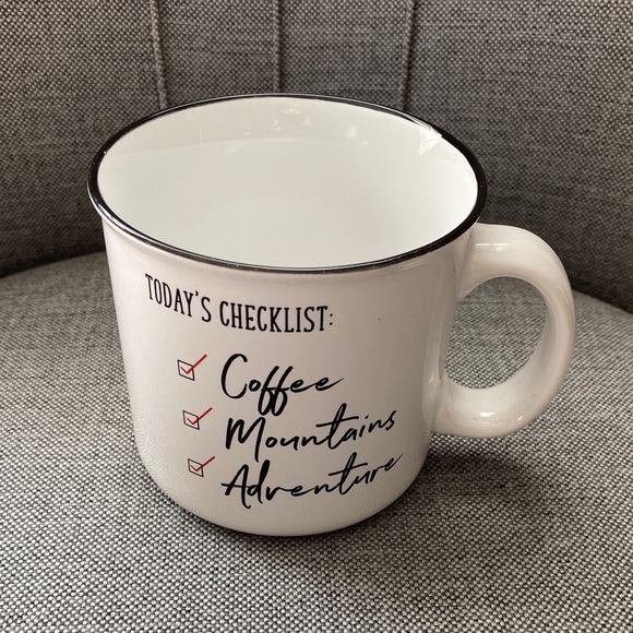 White ceramic camp-style mug with black rim and handle detail. Perfect gift for a coffee loving, mountain exploring, adventure seeking friend or for yourself