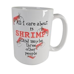 White ceramic with cute shrimp graphics and large bold lettering. Perfect gift for shrimp lovers, seafood fans, or anyone with a sense of humor.
