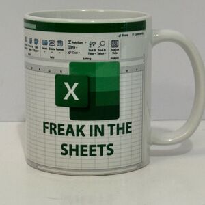 This coffee mug is standard size. It is white and says Freak in the sheets with an excel spreadsheet picture in the background. Great gift for accountants, analysts, statistical analysts, and other jobs. Very clean. Nice as a mug, pen holder, or other holder.