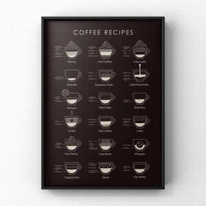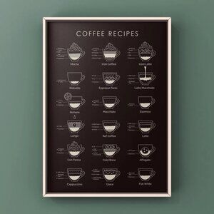 Elevate your space with this stylish and functional Framed Coffee Recipes Poster. Measuring 11x17 inches, this high-quality framed print showcases popular coffee recipes like Espresso, Latte, Mocha, Cappuccino, Iced Latte, and more. Perfect for any coffee enthusiast or barista, this artwork is a chic and informative addition to your kitchen, home office, or coffee bar.