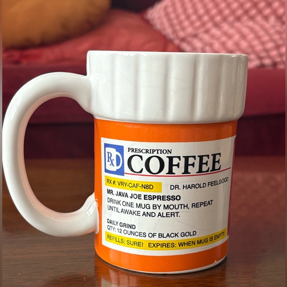 Coffee Rx Mug. Funny mug designed to look like a caffeine prescription bottle.