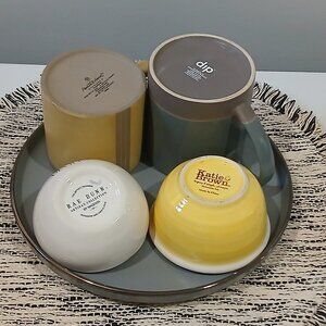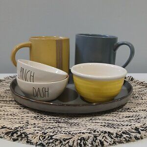 This eclectic Coffee Service Set comes with 2 Large Ceramic mugs, Microwave safe and Dishwasher Safe. The mustard and the tan striped mug, is made with 10% recycled ceramic. The slate mug has a simple terracotta base rim. The RAE DUNN ceramic spice bowls are perfect for a coffee date, which can be used for sugar and cinnamon and such. The small yellow ceramic pottery bowl by KATIE BROWN is dishwasher safe with beautiful and simplistic feel.