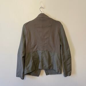 Details: long sleeve jacket L women’s asymmetrical metallic snap button closure pockets utility military futuristic vibes band collar heavyweight
