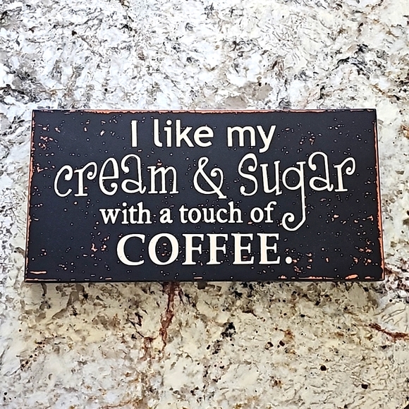I like my cream and sugar with a touch of coffee sign. Measures 15 1/2 inches by 7 1/2 inches 1 inch wide. Made out of very light weight material. 1D