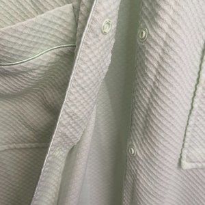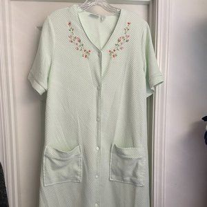 House coat has snap closure down the front and two from front pockets. The is embroidery along the front neckline. - Very Soft - 41" length - 100% polyester