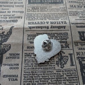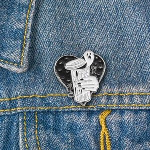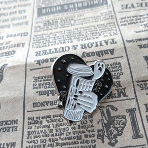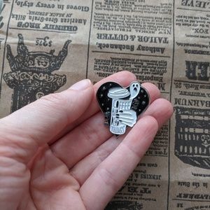 Coffee and Dead things enamel lapel pin brooch. Heart shaped pin with a black background of celestial stars, a to go coffee cup with a ghost coming out of the top as steam, a hand holding the cup, and the cup says "Coffee And Dead Things". The pin has white and black enamel detail set in silver tone metal, pin has a metal clasp backing. Approximately 1” high. Item is New.