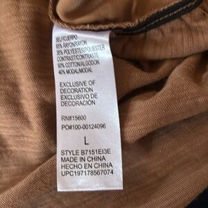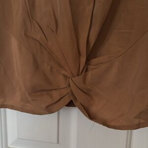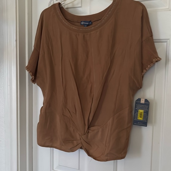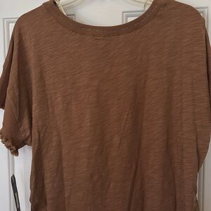 This short sleeved coffee colored to is super cute with details has metallic stitching in sleeve and neckline silky in front and t shirt in back side gathers and front knit so cute tags on
