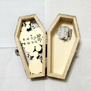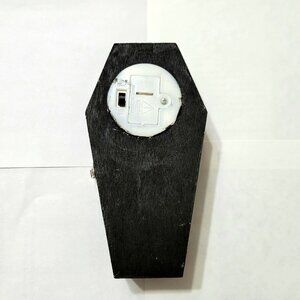 Decorative Coffin light‑up with a multicolor LED module that cycles through changing colors for a glowing, spooky effect. Features themed cutout artwork on the front and a built‑in battery compartment with the battery already installed and working. Perfect for Halloween displays, gothic décor, witchy setups, or as a unique shelf accent. Lights function properly, and the switch and battery housing are intact.