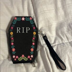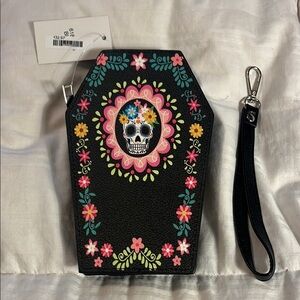 Coffin-shaped wristlet featuring a vibrant floral skull design. Zip opening, interior card pockets, detachable wrist strap. Perfect for a unique style statement. Brand new boutique overstock.