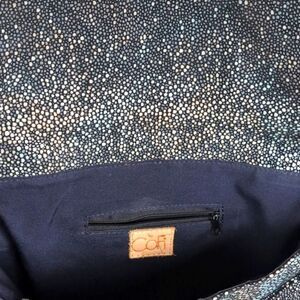 Cofi Bailey leather Festival Flap crossbody black pewter metallic large messenger style meets a fresh, unique printed leather in the Stingray metallic print design. With ample room for all of your essentials, this XL Messenger style handbag is the perfect everyday accessory.