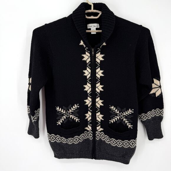 Black 100% wool full zip cardigan sweater. Snowflake design on the front, arms and the back. Front pockets and a shawl collar. Heavy weight thick sweater. Size large in excellent used condition. Laid flat it measures approximately 24 inches armpit to armpit and the length from the top of the shoulder down the back 27 inches.