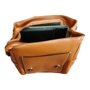 Cognac brown faux leather backpack with white stitching that can convert to a crossbody. Roomy with three interior pockets, front pocket large enough for a phone and an exterior pouch on both sides. Sits nicely and is not bulky.
