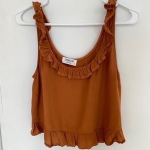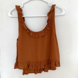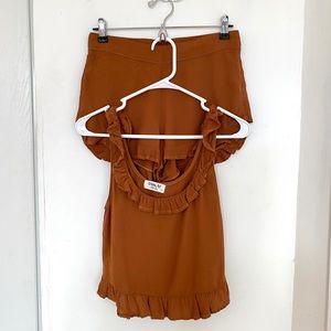 Cognac Two Piece Ruffle Tank/Short Set by SAM & LAVI. Both items are size Small. Worn Once for a photo shoot - like new condition. 100% Rayon, hand wash cold. This outfit looks great with a pair of wedges!