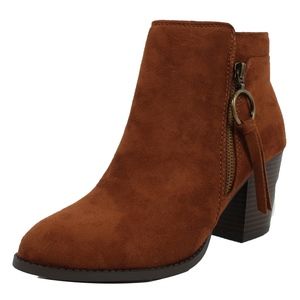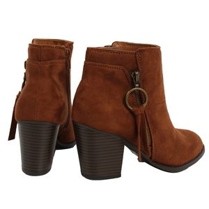 Cognac faux suede zipper tassel design with inner side zipper for easy on/off. Stacked Heel approx 3". Model is a size 7 and a size 7 fits her perfectly.
