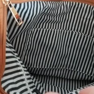 Details: Cognac brown leather messenger-style bag with zipper closure; gold hardware. Can fit 13" laptop.