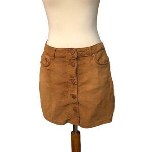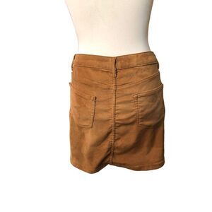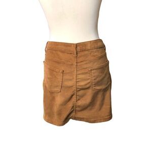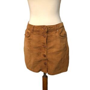 Cognac faux suede feel mini seam details and side and back pockets. Has buttons down the front for a low-key '70s vibe.