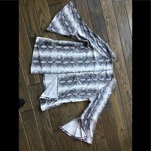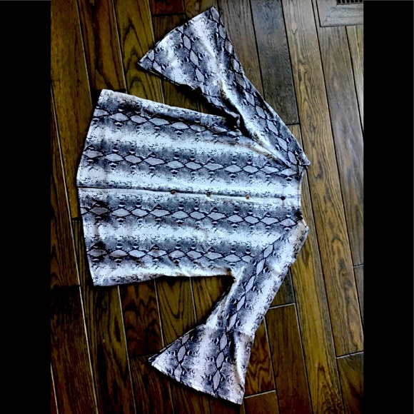 American made chic top with full length sleeves which have a 7 inch opening three quarter way down the inside of the sleeves. The top has a 4 button accent down the back, exposing flesh between top and second buttons and below the forth button.