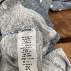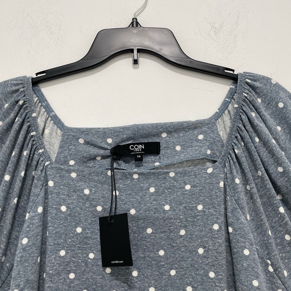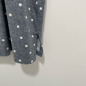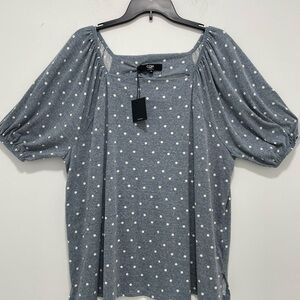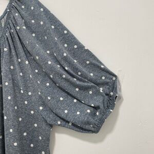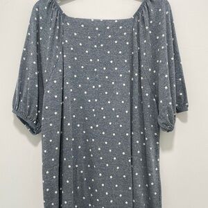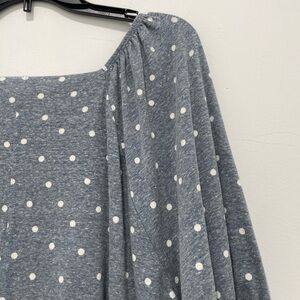 Stylish gray top with white polka dots. Features a square neckline and puff sleeves.