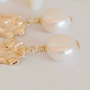 Coin Shape Freshwater Pearl,Dangle Earring,Gold Filled,Wedding Earring,Flowers