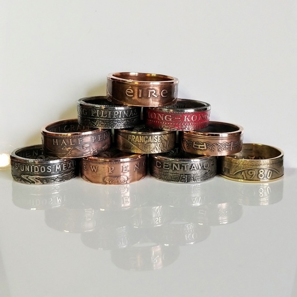 Custom made coin rings from various countries, with beautiful patina and sealed to prevent transfer to beautiful hands. Sizing available in smaller and larger sizes. Thank you for looking .
