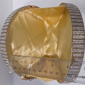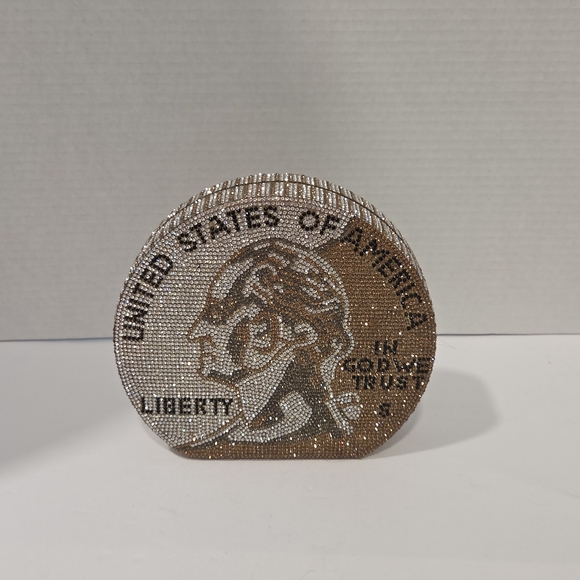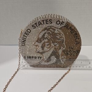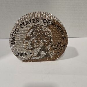 Elegant coin-shaped clutch with sparkling rhinestones. Features detailed design and eye-catching style.