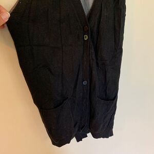 Long, V-neck, sweater vest. With buttons and pockets in the front, and a tie in the back. Back panel is black and white striped silk.