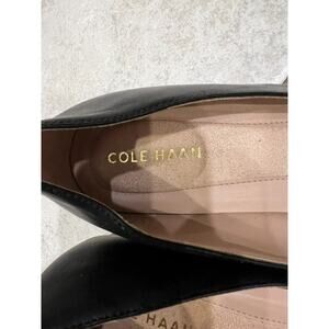 The product is a pair of Cole Haan Black Go-to Block Heel Pumps in size 6.5. These slip-on pumps feature an almond toe shape, low block heel, and are crafted from leather. They are suitable for various occasions such as party/cocktail events, workwear, and business meetings. The black color and sleek design make them versatile for all seasons, fitting seamlessly into a city, career, or preppy-themed wardrobe.