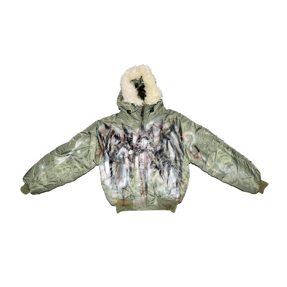 Super rare 1/1 airbrush jacket by artist coldf33t. Airbrushed acrylic on a premium vintage military bomber jacket with real fur. Imported from the UK.
