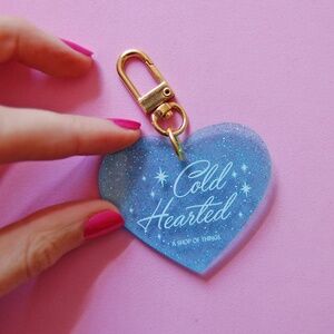 Keychain measures 2.25" x 1.875" and is blue translucent glitter acrylic.