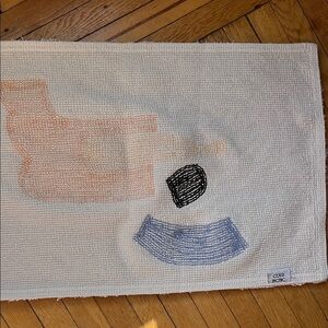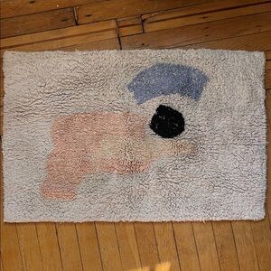Cold Picnic Bath Mat Cream with blue, black, peach and pink accents Used condition with a lot of life left