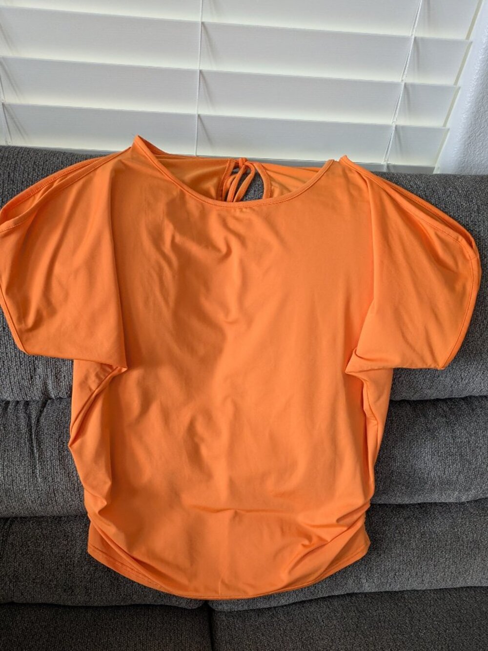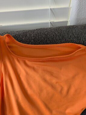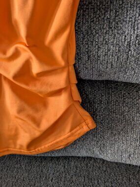 Great condition! Beautiful cold shoulder top in a light orange with ruched sides and a keyhole neck tie. Size L