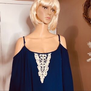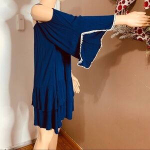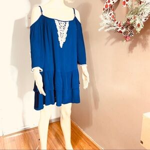 Adjustable cold shoulder dress by Alya. Royal blue dress with white lace detail. On trend bell sleeves
