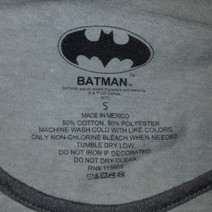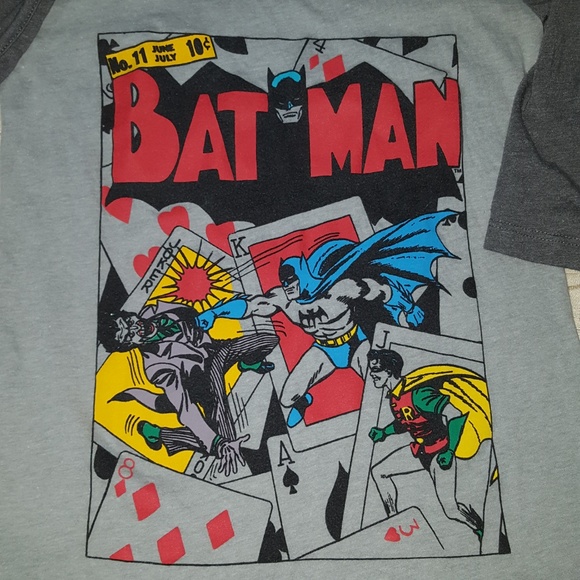 Batman branded cold shoulder raglan t-shirt in a heathered gray and charcoal burnout cotton material. The graphic is the cover of Batman Issue #11 "The Joker's Advertising Campaign."