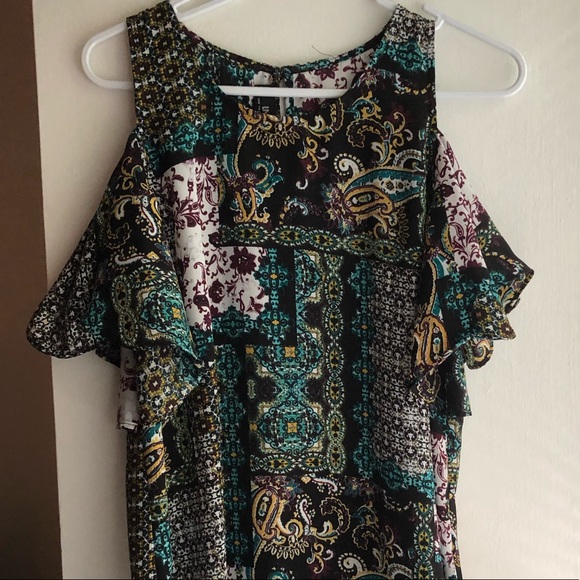 -Features flattering cold shoulder design and bright print, perfect for summertime!