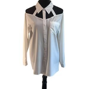 Cold Shoulder Button Up Shirt Long Sleeve Blouse White Oversized Sz S NWOT