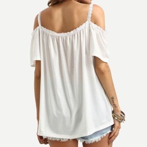 Contrast lace cold shoulder spaghetti strap short sleeve regular fit fabric has some stretch hi lo