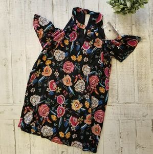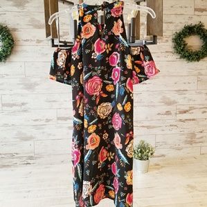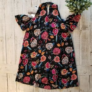 NWT beautiful floral cold shoulder dress! This dress is so pretty and so in style! Two button collar neck and black under slip.