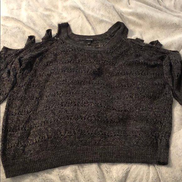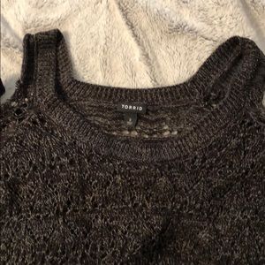 This is a cold shoulder knit top with lattice detailing on the sleeves from Torrid in a size 3. You will definitely need a tank top to go under this unless you want to show some skin.