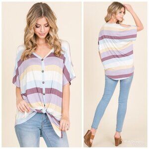 This cold shoulder multi-color stripe tunic has wooden buttons, tie detail on front, and a high low hemline.