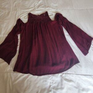 Make a splash in this rich dark red purple gauzy top. It has cold shoulder bell sleeves.