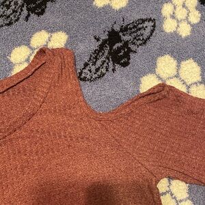 Stylish cold shoulder ribbed knit top in a warm mauve color. Perfect for casual outings.