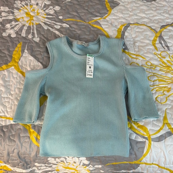 Stylish and comfortable, this cold shoulder ribbed top is perfect for any occasion. The soft blue color adds a touch of elegance to your wardrobe.