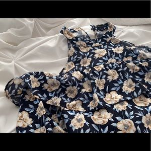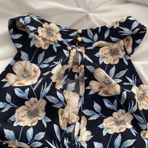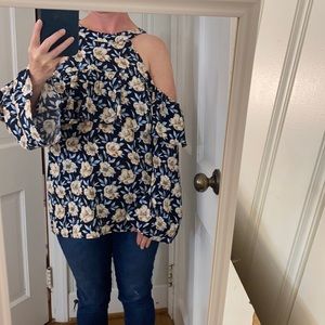 Flowy Cold Shoulder ruffle blouse with gold button detail back of neck closure.