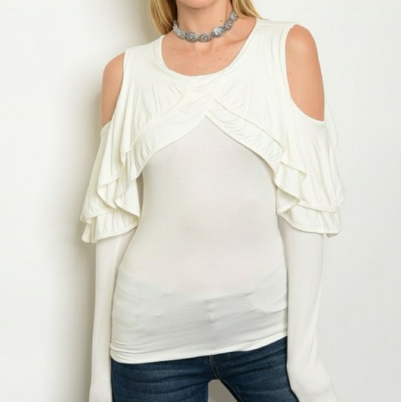 Long sleeve top with exposed shoulders and cascading ruffles.