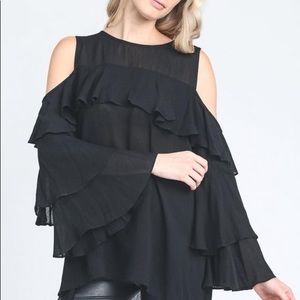 TEXTURED LIGHTWEIGHT OFF-THE-SHOULDER TOP FEATURING STATEMENT BELL SLEEVES, WITH CROCHET DETAILING SMOCKED ELASTIC NECKLINE, RAYON GAUZE BABYDOLL TUNIC