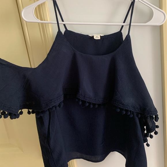 This shirt is very cute. It has a cold shoulder and it has ruffles on the front and back and sleeves. At the bottom of these raffles there are tassels. This shirt has never been worn before. If you have any questions or offers please feel free to ask :)